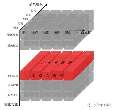 工业互联网位于智能制造系统架构生命周期的所有环节、系统层级的设备、控制、工厂、企业和协同五个层级,以及智能功能的互联互通。