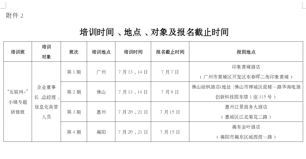 本次培训7月13日到7月21日,培训班共4期,每期培训2天,每期限招80人。培训对象为企业董事长、总经理、信息化高管人员。培训地点为:广州、佛山、惠州、揭阳。具体培训时间、地点及对象见附件2。