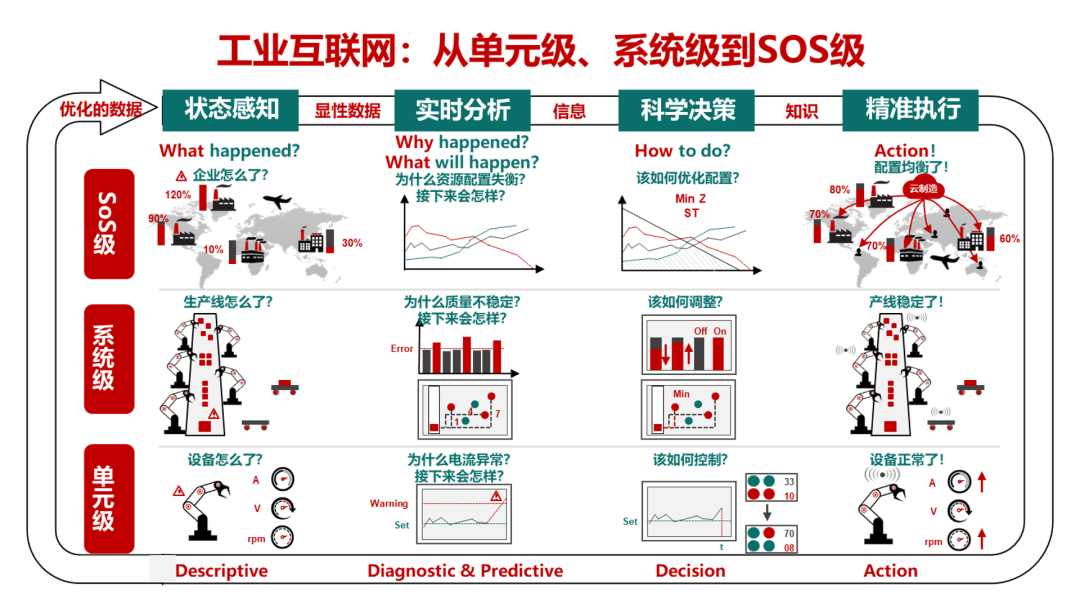 三是系统之系统级(即SoS级)。工业互联网的系统级实现了跨系统、跨平台的互联、互通和互操作,促成了多源异构数据的集成、交换和共享的闭环自动流动,在全局范围内实现信息全面感知、深度分析、科学决策和精准执行。基于大数据平台,通过丰富开发工具、开放应用接口、共享数据资源、建设开发社区,加快各类工业APP和平台软件的快速发展,通过实现横向、纵向和端到端集成,形成了开放、协同、共赢的产业新生态。