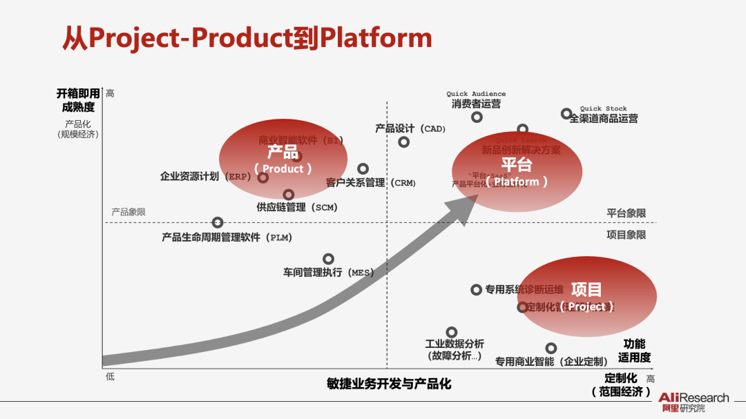 过去30年里,企业数字化建设大概有两种模式:买开箱即用的套装软件和定制化自研。套装软件(Porduct)是全球最佳实践的结晶,如企业资源计划、客户关系管理等,有成熟咨询、实施、部署流程,也有更好的性价比,但许多产品功能的适用性比较差,更新迭代周期比较慢。定制化自研(项目型Project)产品的针对性、适用性比较强,但面对复杂业务场景缺乏最佳实践,实施、部署、运营面临许多风险和不确定性。