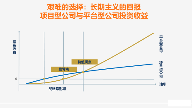 但对于所有致力于成为工业互联网平台的决策者而言,每个能力迭代和战略升级,都是一次艰难的选择。项目型公司、产品型公司更容易达到盈亏平衡点,平台公司需要一个比较长的战略忍耐期。当平台公司跨过了价值拐点,就会进入一个指数化增长新阶段,这是对坚持长期主义回报的选择。