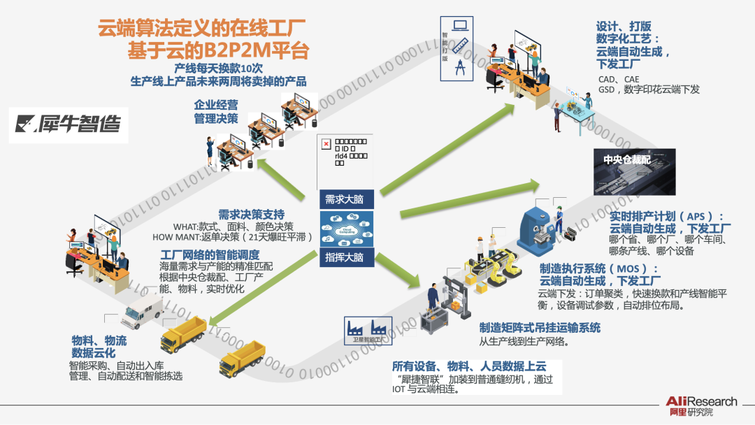 以阿里犀牛智造为代表的云端制造模式,体现了软硬解耦从单机走向系统的发展趋势。阿里犀牛智造在过去几年的探索,就是建立一个云原生的数字化解决方案,通过推动单机设备、智能产线、工艺优化、车间管理、经营管理、产品开发等全面云化,实现需求分析、研发设计、工艺优化、排产计划、制造执行、物流管理的云端决策、下发到边缘和工厂执行,实现端到端的供需精准匹配,以及小批量和高频换线。