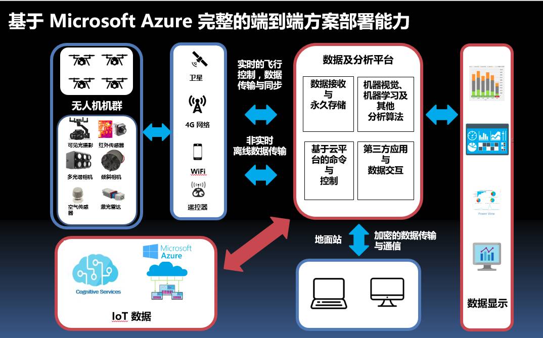 从技术架构来说,认知服务Cognitive Service和IoT data都是微软平台上已经搭载着的相关服务,可以让企业减少开发时间,不需要什么细节都从头开始部署,只需要专注在自己需要搭建的机器视觉机器学习模型和调优,大数据分析平台、无人机硬件参考设计以及行业无人机解决方案上。