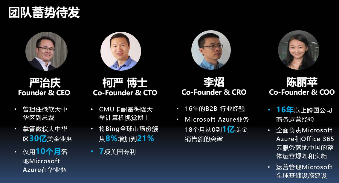 CTO柯严,是卡耐基梅隆大学机器视觉专业的博士, 曾经是微软Bing search的在美国总部的研发团队负责人,帮助Bing Search的全球市场份额从8%增长到21%。