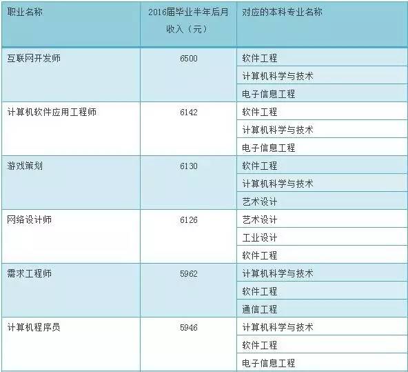 通过对今年最新发布的2016届大学生毕业半年后从事的前30位高薪职业及其对应专业(前3位)的研究分析,我们发现:互联网开发师成本科、高职高专毕业生从事的薪资最高职业,对应的主要本科专业:软件工程、计算机科学与技术、电子信息工程,对应的主要高职高专专业:软件技术、计算机应用技术、计算机网络技术。