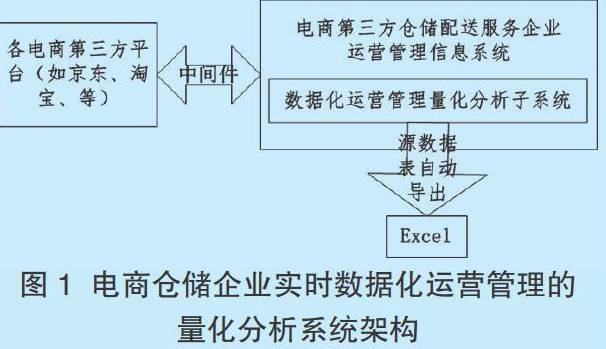 电商仓储企业运营管理信息系统通过中间商与各电商第三方平台实现数据对接。根据电商仓储企业数据化运营管理的量化分析体系表,对现有电商仓储企业的运营管理信息系统进行功能升级,增加数据化运营管理量化分析子系统,以实现5个指标类型下的25个量化指标功能。同时,数据化运营管理量化分析子系统能实现源数据表自动导出到Excel中的功能,以实现实时数据分析。电商仓储企业实时数据化运营管理的量化分析系统架构如图1所示。