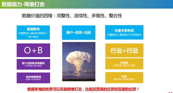 然后讲了数据维度的重要性,希望大家多用O域的数据(最核心的网络大数据,以前很少用),与传统的B域结合,可以爆发出怎样的惊人能量: