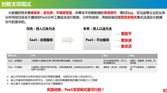 智慧运营是公司今年提出的一个理念,即以大数据为驱动,大IT为支撑,通过管理和效率改善,提升价值创造和客户体验,重点讲了大数据运营”搭台唱戏”的概念,阐明了为什么业务人员是大数据运营的主角及PaaS模式的精髓,让业务人员理解这一点很重要。