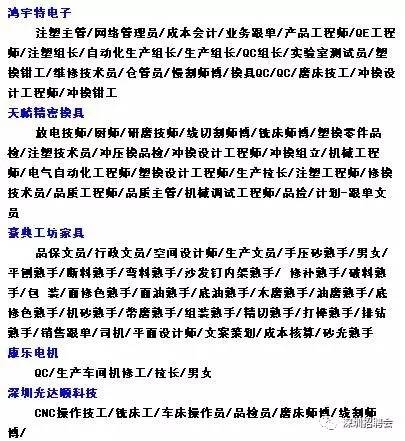 文员/调度员/工艺工程师/跟单文员/CNC技工/装配工/装配电工/普工/震砂工/喷油工/电焊工/车床工/钻床工/铣床工/锯床工/仓管员/数控车床工/打磨工/钣金工/高级机修工/机修学徒/品检员/装配叉车工/抛光工/电镀工/CNC磨床工/无心磨床/外圆磨床