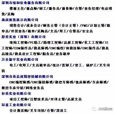 移印/丝印技术员/产品结构工程师/物料员/样板员/生产计划员/采购员/自动化技术员/仓管员/保安员/生产拉长/品管部QC/IPQC组长/自动组装车间领班//厨师