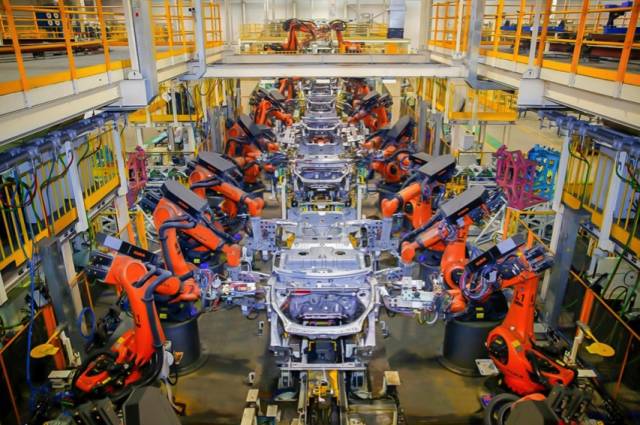 完美的车身冲压件成型后,就会被送到焊装工艺环节,构筑完整的车身。广汽传祺焊装厂秉承SSC(小型化、简单化、轻量化)的理念,实现零件的按需配送,部件的流动采用空中输送,降低厂房面积。采用柔性伺服定位系统,车型切换时间小于1分钟,能够实现5款车型的混流生产,柔性化、智能化处于行业先进水平。
