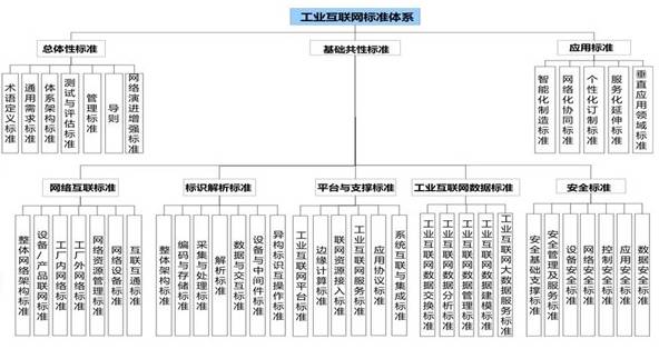 工业互联网产业联盟根据工信部的指导、中国信通院、航天科工等28家单位联合研究,结合智能化生产、个性化定制和服务化延伸等领域的优秀实践应用案例,总结制定了《工业互联网体系架构(1.0版本)》,紧密结合技术产业发展和标准化需求,为工业互联网发展提供参照标准。标准体系提出总体性标准、基础共性标准、应用标准等3大类一级标准和44个重点标准化方向,其中总体性标准下设7个标准指标;基础共性标准下分出5个二级标准和32个三级标准;应用标准下分5个具体指标。具体如图所示: