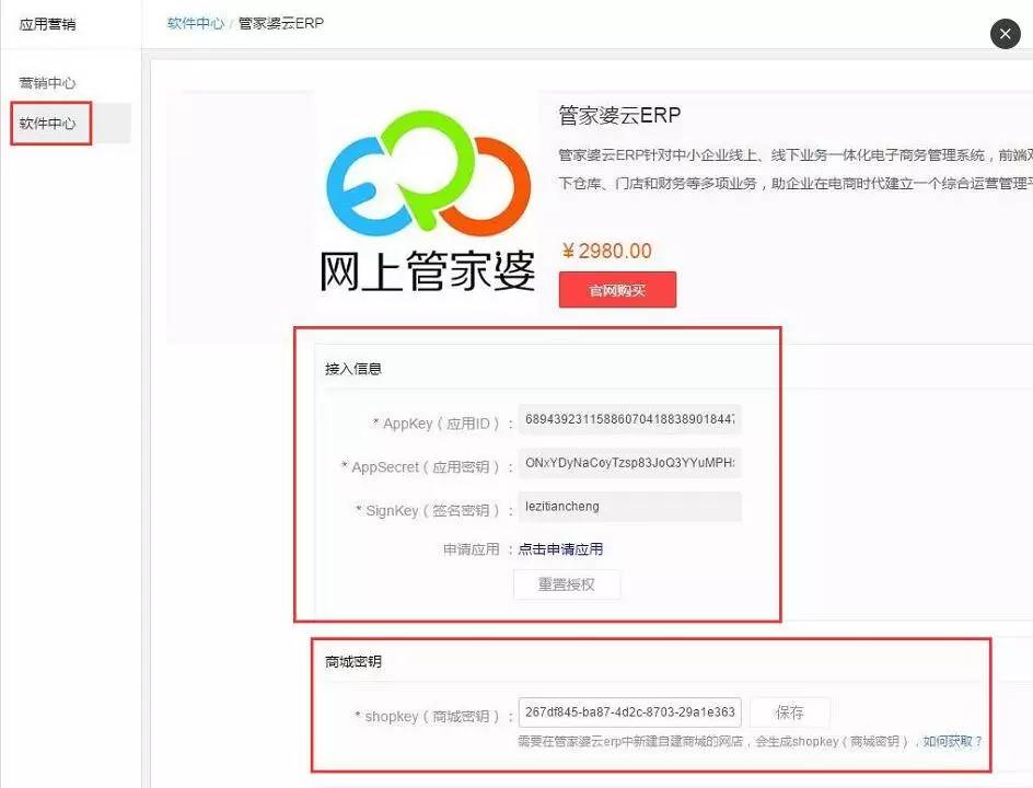 凯钧电商当然也是深谙其理,所以我们在商家管理系统【应用营销】模块添加了【软件中心】,和【营销中心】并列呈现。软件中心用以对接其它应用,好让商家店铺能在其它应用里进行相关工作。而软件中心呈现的第一个对接应用,即本周新功能介绍主题,就是——电商ERP,商家店铺可对接管家婆云ERP。自带管理系统,为何对接ERP