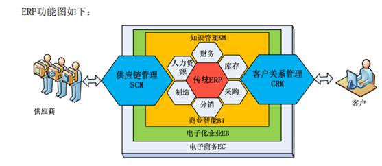 何为ERP?ERP是集供应链管理和客户关系管理为一体的服务体系,涉及人力资源、财务、库存、采购、分销等诸多领域,是连接供应商与客户的桥梁。具体情况见下图: