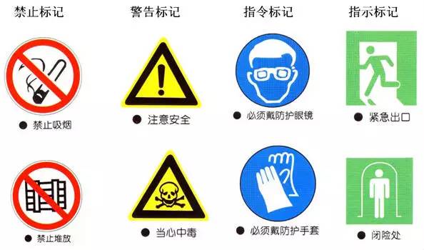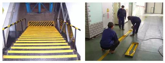 护栏、楼梯扶手常用黄黑相间颜色,大门推拉区域、消防器材前、电气柜前,常用黄黑班马线警示标识。电气警示标识、交通标识,常用红白警示。