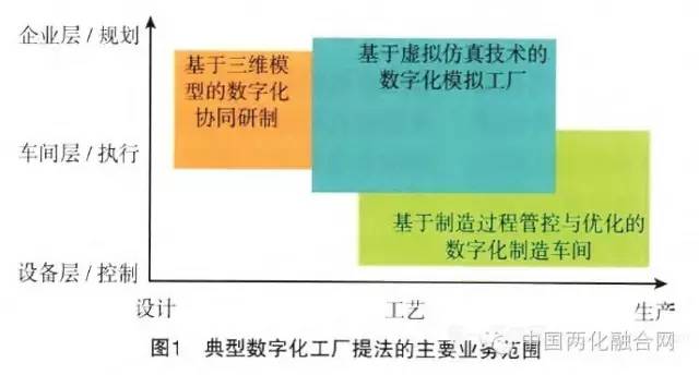 上述提法中比较典型的有3类:基于三维模型的数字化协同研制,基于虚拟仿真技术的数字化模拟工厂和基于制造过程管控与优化的数字化车间。从制造管理的层次和从设计到制造的过程2个维度来看,它们涉及的业务范围大致如图1所示(典型数字化工厂提法的主要业务范围)。