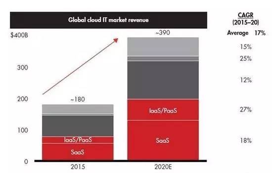据Bain&Company公布的最新报告显示,到2020年全球云计算市场的规模预计将升至3900亿美元,年复合增长率(CAGR)将达到17%。当前来自公共和私有云服务及相关设备的利润达到了2012年时期的4倍,其中向终端客户提供云服务的提供商占据了其中20%的利润。同时期内,基于SaaS的应用市场规模的CAGR为18%,基于IaaS/PaaS应用市场规模的CAGR为27%。