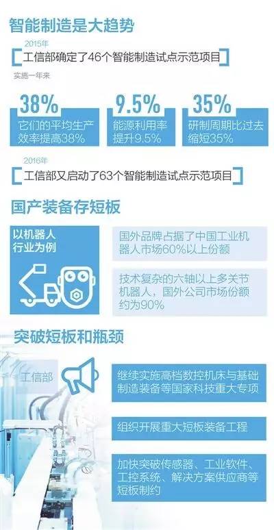 为突破短板和瓶颈,工信部将以高端装备、短板装备和智能装备为切入点,狠抓关键核心技术攻关。一是继续实施高档数控机床与基础制造装备等国家科技重大专项,深入实施增强制造业核心竞争力三年行动计划,启动实施智能制造与机器人等科技创新重大项目;二是组织开展重大短板装备工程,集中支持重点领域创新发展和传统产业改造提升所急需装备的工程化、产业化项目;三是加快突破传感器、工业软件、工控系统、解决方案供应商等短板制约,实现一批智能装备和系统的工程化、产业化应用。