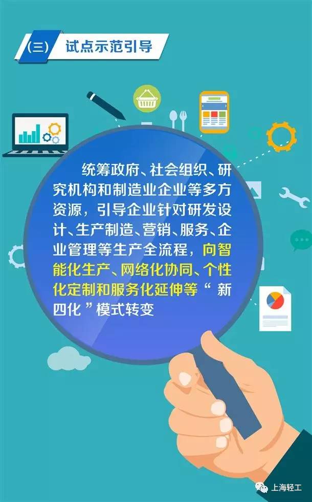 统筹政府、社会组织、研究机构和制造业企业等多方资源,引导企业针对研发设计、生产制造、营销、服务、企业管理等全流程,向智能化生产、网络化协同、个性化定制和服务化延伸等“新四化”模式转变。引导基于企业现场数据集成整合的生产制造过程智能化应用,实现生产方式向智能化转变;引导基于网络、数据驱动的生产资源配置新模式,实现资源配置向大众创新转变;引导基于供应链数据集成和企业数据垂直打通,实现需求响应向规模定制转变;引导基于产品全流程数据采集分析的智能化服务,实现产品服务模式向全生命周期管理转变。依托上海制造产业发展基础良好、建设体系架构完整、具有领军示范作用的产业集群打造工业互联网综合示范基地,创建国家级工业互联网示范区。