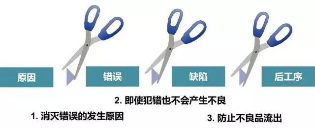 而新的防错方式(POKA-YOKE),用一套设备或方法使操作员在操作时直接可以明显发现缺陷或使操作失误后不产生缺陷。操作员在自我检查,失误也会变得明白易見。