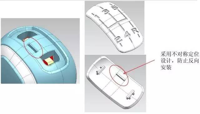将会造成错误的原因从根本上排除掉,使绝不发生错误。下图是一个排挡机构的塑料面板,在面板和基座上故意设计了一个凸起和凹槽,从设计层面避免塑料面板装反的情况。