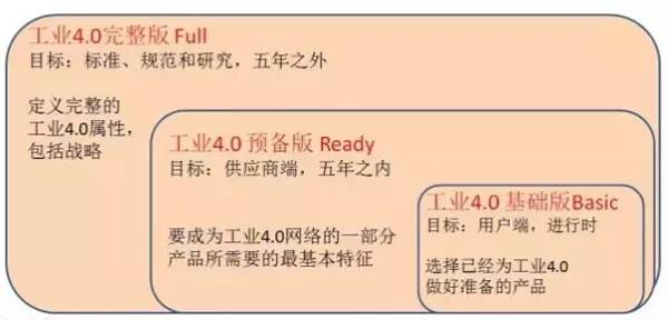德国电子与电气工业协会(ZVEI)认为,“基础版工业4.0”处于进行之中;而 “预备版工业4.0”只要不到5年的时间,而从“完整版工业4.0”则在五年开外的时间。