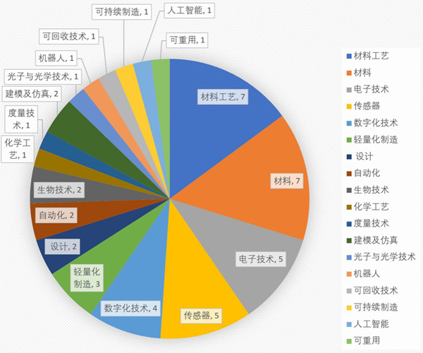 对于美国已创建的创新机构的重点特色技术领域,从统计如图所示,可以明显地看出来,所有涉及技术领域中,按被列为创新中心关键技术的频次,计算与材料及材料工艺相关的占了逾三分之一;12家创新中心,有7家涉及了材料工艺,6家涉及了材料。