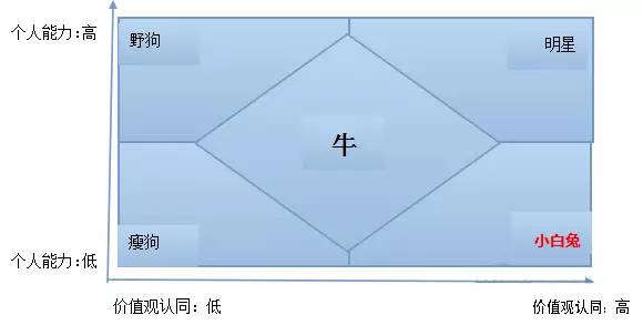 大家知道,对于人才管理,有句话叫“能者上,平者让,庸者下”。如果把人才再细分一下,除了能者、平者,庸者以外,还可以分成5种类型:明星、瘦狗、野狗、小白兔和牛。以此为基础,产生一个矩阵,这个矩阵的横坐标代表价值观认同,纵坐标代表个人能力。