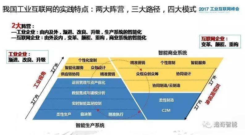 据工业互联网产业联盟秘书长余晓晖总结,两大阵营是指工业企业和互联网企业,两者具有不同的路径,如工业企业推进工业互联网的时候,更侧重的是生产系统的优化、资产管理的优化,总体上讲是一种渐进改良产业升级的道路,如树根互联具有三一重工的工业企业背景和基因。