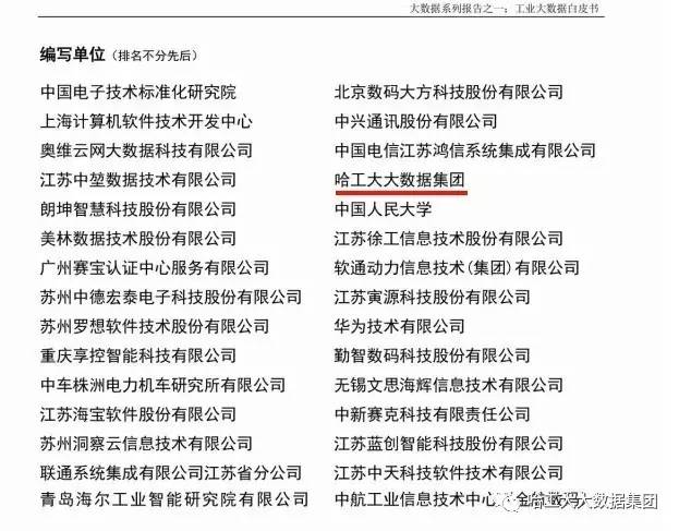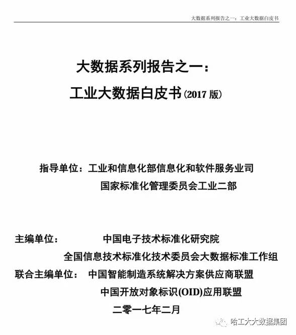 戳上面的蓝字关注我们哦!2017年2月18日,在工业和信息化部和国家标准化管理委员会的指导下,《工业大数据白皮书》在北京正式发布,哈工大大数据集团参与编著。