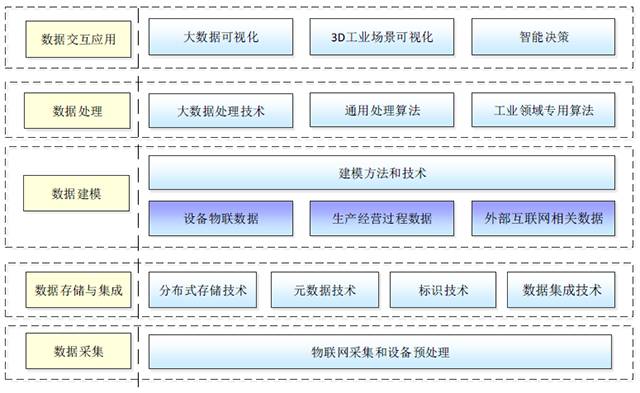 工业大数据技术架构共有五个部分,分别为数据采集层、数据存储与集成层、数据建模层、数据处理层、数据交互应用层。