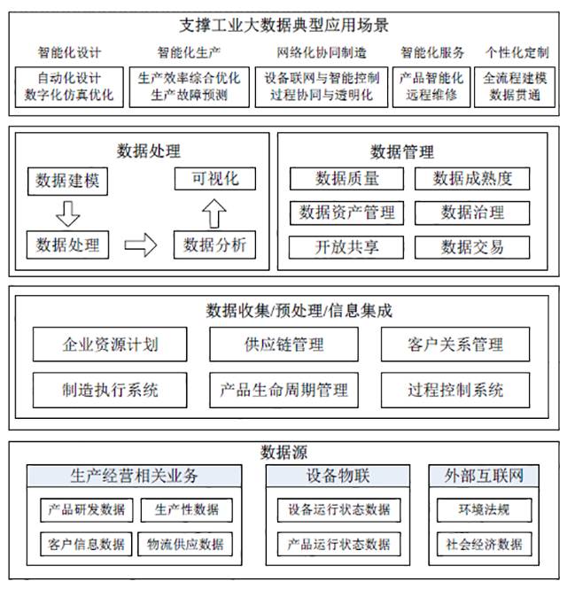 工业大数据应用的目标是构建覆盖工业全流程、全环节和产品全生命周期的数据链,工业大数据在实际应用当中涉及到的主要环节:数据源、数据收集与集成、数据处理与数据管理、典型应用场景等四个层次。