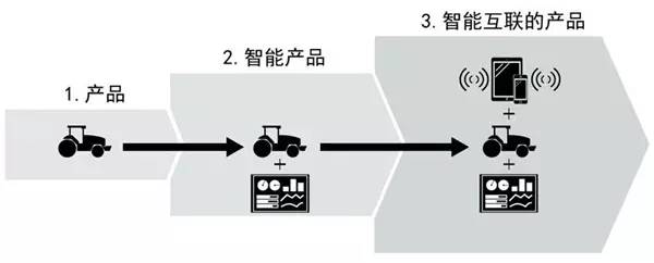 智能互联产品图片来源:哈佛商业评论2014.10智能互联产品设定了三个核心要素:物理要素、智能要素和互联要素。物理要素由产品的机械和电动零件组成。例如:汽车的物理要素包括引擎、轮胎和电池;智能要素由传感器、微处理器、引擎控制单元等;互联要素由设备接口、连接协议组成。如:一辆汽车与一台汽车诊断设备连接;或者与性能监测、远程服务等连接。说到这里,这个故事还是有些干巴。然而,如果看清这次添加的因素是数据,而不是任何其他物理模块。我们会发现,智能互联产品的数据基因,有可能布局重塑产业内的竞争,而且还拓宽了产业本身的定义。当产品与另外多个产品以及外部数据库连接,产业生态系统出现了。一套各种类型的农业设备与另一套农业设备连接,同时连接到基于地理位置的数据库,一个农业生态系统开始出现了。美国农机设备制造商迪尔公司(John Deere)和爱科公司(AGCO),现在都开始把农业设备连接,产业从拖拉机制造扩张到农业设备优化。自动耕作机根据准确的深度和间隔距离把氮肥注入土壤,然后播种机紧随其后,把玉米种子之间埋入刚施肥的土壤中。然后还有灌溉系统和施肥系统的精准接入,与此同时参考天文气象、农产品价格和农产品期货等信息系统,目的是优化总体农业收益。