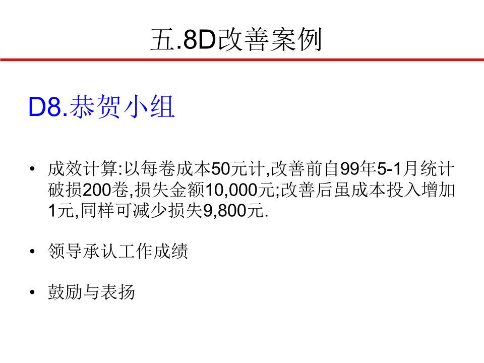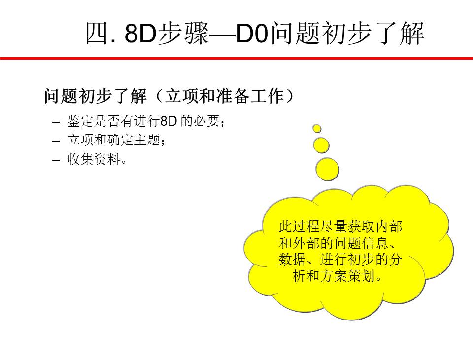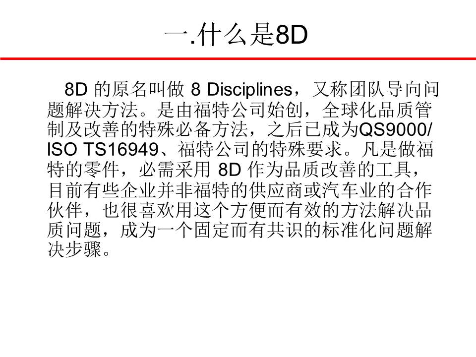 8D法是美国福特公司解决产品质量问题的一种方法,曾在供应商中广泛推行,现已成为国际汽车行业(特别是汽车零部件产家)广泛采用来解决产品质量问题最好的、有效的方法。