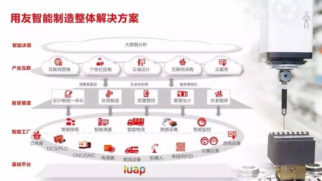 在新的发展形势下,用友积极探索,基于对《中国制造2025》、两化融合、互联网+制造业等相关政策体系的研究,结合对制造企业转型智能制造需求的理解,形成用友智能制造整体解决方案: