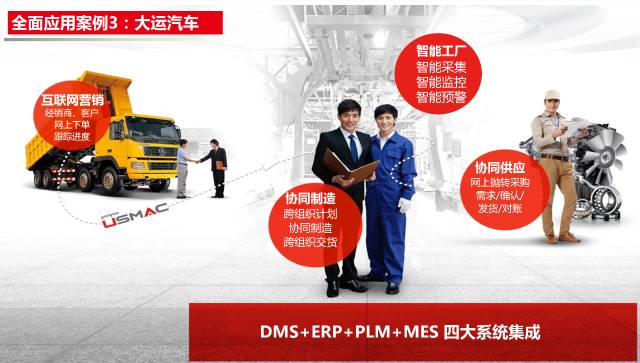 山西大运汽车制造有限公司,借助互联网,实现300多家经销商、500多家服务站网上个性化选配、自助下单、自助跟踪生产进度,极大节省沟通成本;实现与300多家供应商的业务协同,极大缩短与供应商的信息交互时间与沟通成本,订单交付周期缩短30%。经过短短4年多的快速发展,大运汽车在中国重卡行业排名从10名之外,已经进入到第6名。