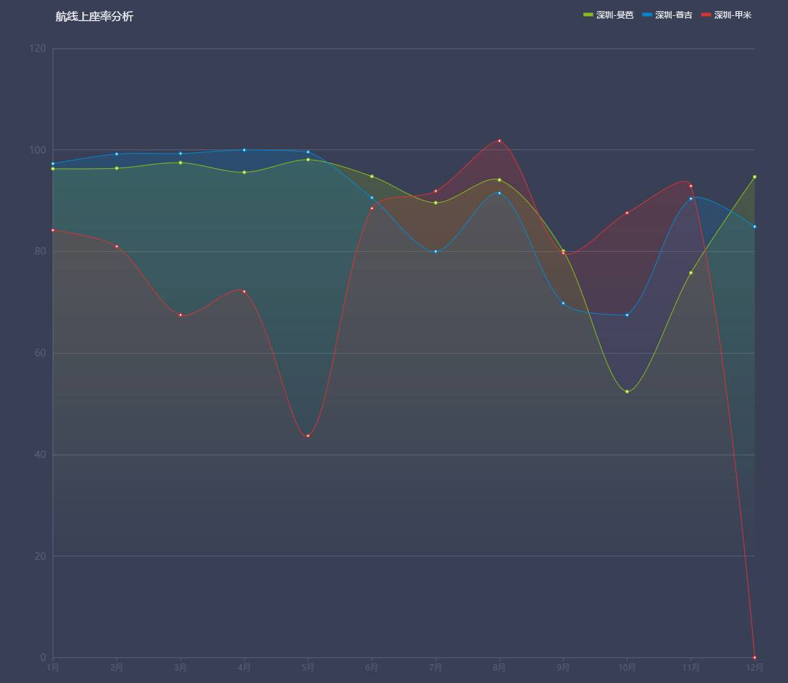 机票库存管理功能是今年一月份才重磅上线的功能之一,迅速受到广大用户的高度好评和高频率使用。近日,结合用户的进一步需求,我们快马加鞭新增研发了对航线上座率的分析功能,可支持同一条航线不同时间的同比分析,支持同一年度不同的航线对比分析,也可查看到具体每个航线、每个月的班次、上客数等,所有数据均实时自动更新,将是包机服务商在经营决策上不可或缺的一项具有指导性意义的数据。如图所示: