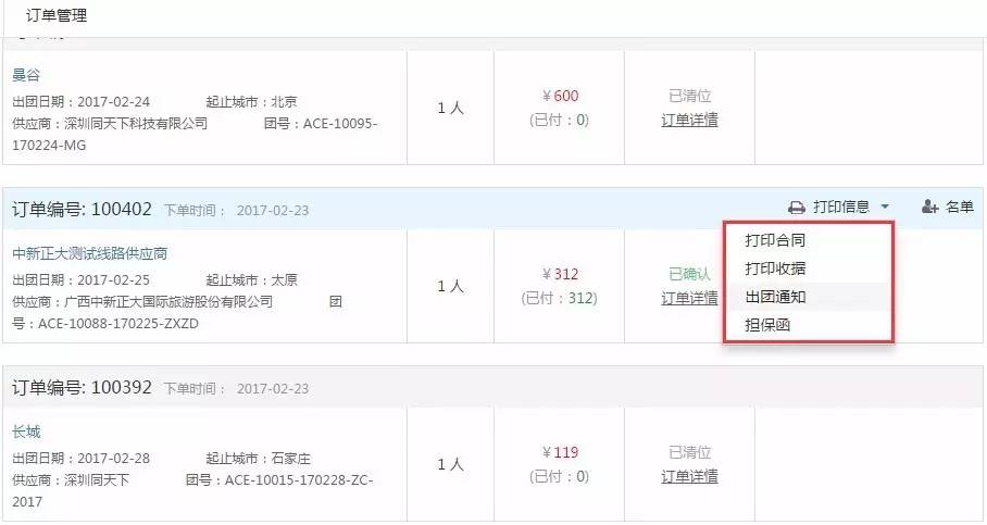 为了更便于用户使用,近期B2B平台会员中心再新增打印合同、担保函、收据、出团通知书,B2B 平台游客名单列表优化及资料上传等。如图所示:
