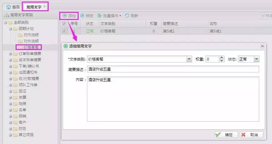 1.资源-常用信息-常用文字新增简要描述,以下有模板的位置可以调用。