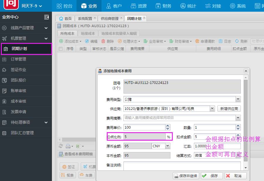 团期交易中供应商给优惠怎么体现?供应商优惠添加负数成本繁琐?不用担心,供应商扣点功能可以解决这个问题啦!现在供应商可在后台手动设置好扣点比例,也可以直接编辑金额,相应的成本就会减少这部分扣点金额了。如图所示: