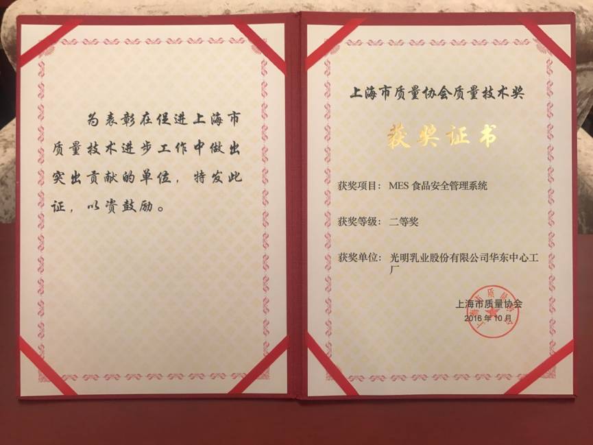 2017年2月27日,光明乳业华东中心工厂,参选的《MES食品安全管理系统》项目,在2016年度上海市质量协会质量技术奖评选会议中,经过各项答辩及专家评选后,荣获《2016年上海市质量技术奖二等奖》。
