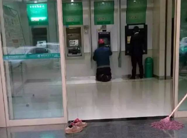 1农民工师傅进入银行前,想脱掉鞋子,因为鞋太脏了怕弄脏地面,不想给保安带来不必要的麻烦。保安说,没事没事,你进去,我一会儿再拖一次。可农民工却坚持脱了鞋,跪着去ATM机前进行操作。