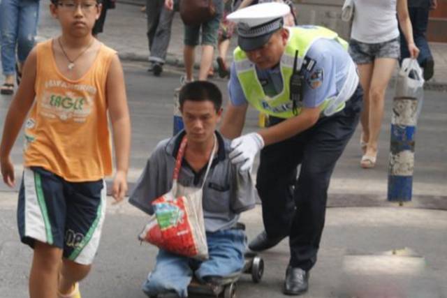 乞讨骗子虽有,但不可一日而语。这位交警仅仅是帮助他快速通过马路,但也使人心的善良走得更远。