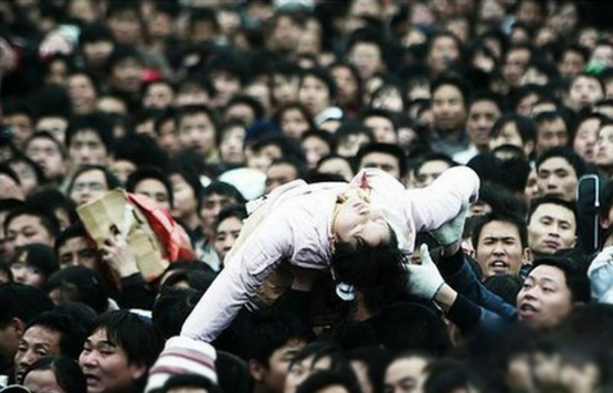 广州火车站。大批乘客集聚在火车站广场外准备进站,一乘客晕倒在人群中,众乘客以抬高接力的方式把其送进广场。