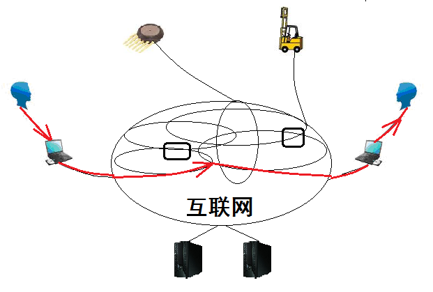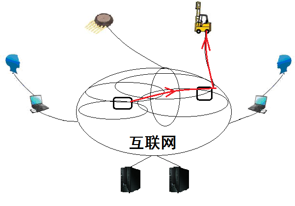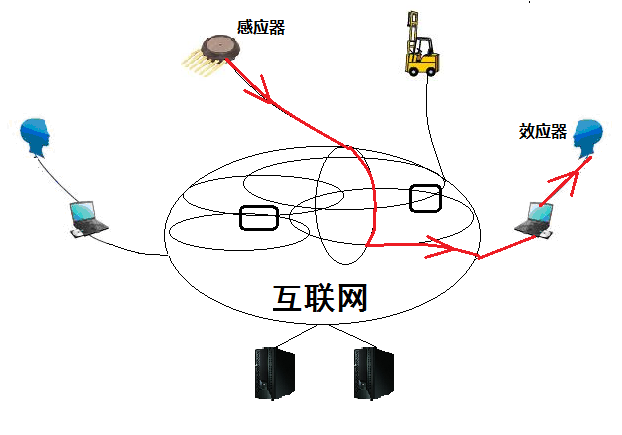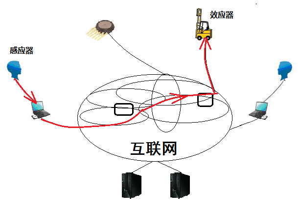 第一种是网络传感器到联网智能设备的反射弧:例如,在大楼里,温度传感器检测到室内温度升高超过100度,同时气敏传感器检测到室内二氧化碳浓度升高,于是报警信息通过互联网线路传送到服务器中心,服务器发送指令给大楼灭火机器人,由该楼层灭火机器人操控水枪进行灭火。
