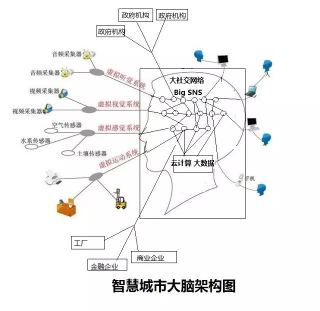 这个大社交网络与智慧城市紧密的结合是智慧城市能否建设成功的关键,也就是说智慧城市的每个要素,无论是居民,企业,政府机构,路灯,车辆,工场,都要以城市神经元的方式加入到智慧城市的大社交网络,这些城市神经元的互动,聚合,链接将成为城市变成智慧城市的关键点。城市中枢神经系统(云计算建设),城市感觉神经系统(物联网建设),城市运动神经系统(工业4.0建设),城市智慧的产生与应用(大数据与人工智能建设)的产生而是以此为基础才能真正运转起来。综上所述,基于互联网云脑架构的智慧城市示意图如下图所示: