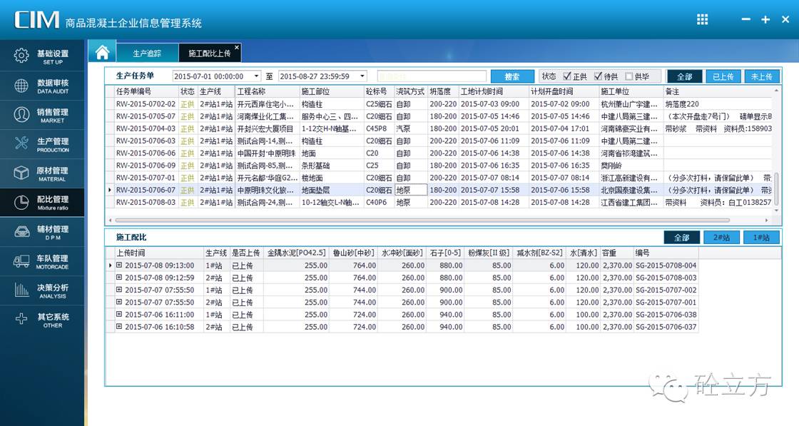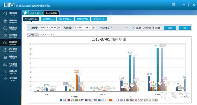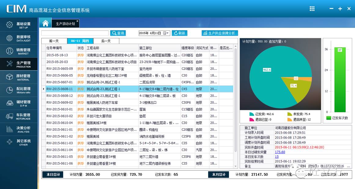 原材料采购环节:车辆过磅后,采购数据将自动录入到系统中;同时,生产消耗的原材料数据也由电脑实时监控,自动录入到协砼ERP系统。这使得一方面采购数据传输更准确(消除人工失误,虚假报账),数据传递更快捷(实时记录、实时反应);另一方面库存数量更明确,更易掌握,便于安排生产计划。