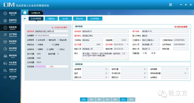 销售环节:销售走订单流程,将客户名称、责任人、联系方式、工地、价格等关键数据直接输入到协砼ERP系统中,其他职能部门根据协砼ERP指令进行工作。这使得订单详细信息的跨部门使用变得更加方便;另外协砼ERP系统设置客户与销售人员的信用额度的功能也使得销售风险可控,避免了道德风险以及其他人为因素(销售人员离职等)给企业带来的损失。