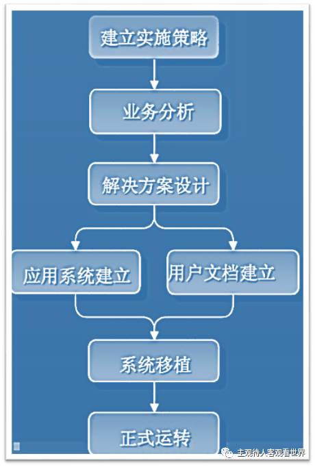 第一个阶段:建立实施策略。在此阶段,实施企业需要成立以高层管理者为首的实施领导小组,同时由高层管理者参与选择参与项目的人员,成立项目实施小组。在该阶段,还要对全部人员进行企业业务知识和知识的初步培训,并制定出企业实施的具体策略和实施目的。