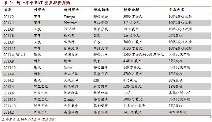 曾经有人寄希望与移动互联网的发展能够打破BAT一统天下的格局,但是2013年互联网的并购热潮显然是这三家互联网巨头瓜分二线资产的圈地活动,由于行业内巨头间跨界竞争的激烈程度在不断加剧,以及BAT手中资金依然充裕,有理由认为2014年行业中并购整合会继续,这会使得马太效应继续放大,新参与者难有立足之地。